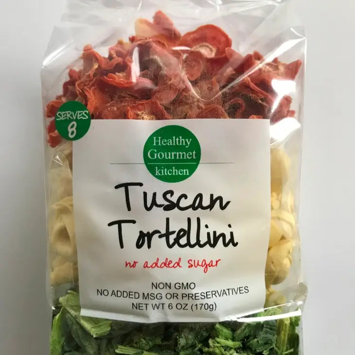 Tuscan Tortellini - Tuscan Tortellini soup is as beautiful as it is delicious. Bursting with flavor this broth based soup is ready in 30 minutes. It's perfect with sausage however you can omit for a vegetarian option. Tortellini contains wheat and cheese (milk). Makes 8 one cup servings.