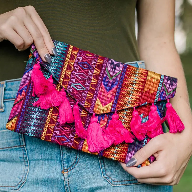 Modern lines with a pop of color~ the woven geo clutch is the bright accessory that will take your go-to outfit to the next level. This clutch is complete with tassles to transition your day time outfit to your friday night fiesta look! Each purchase empowers artisans in Guatemala. -Dimensions: 10"l x 7.5"w, front flap 4" H-2 inside pockets on one side 5"h x 4.5" w -Complete with 22" strap-cotton materials and synthetic lining. Please note, due to this item being handmade coloring may vary. Individual photos are the exact item.