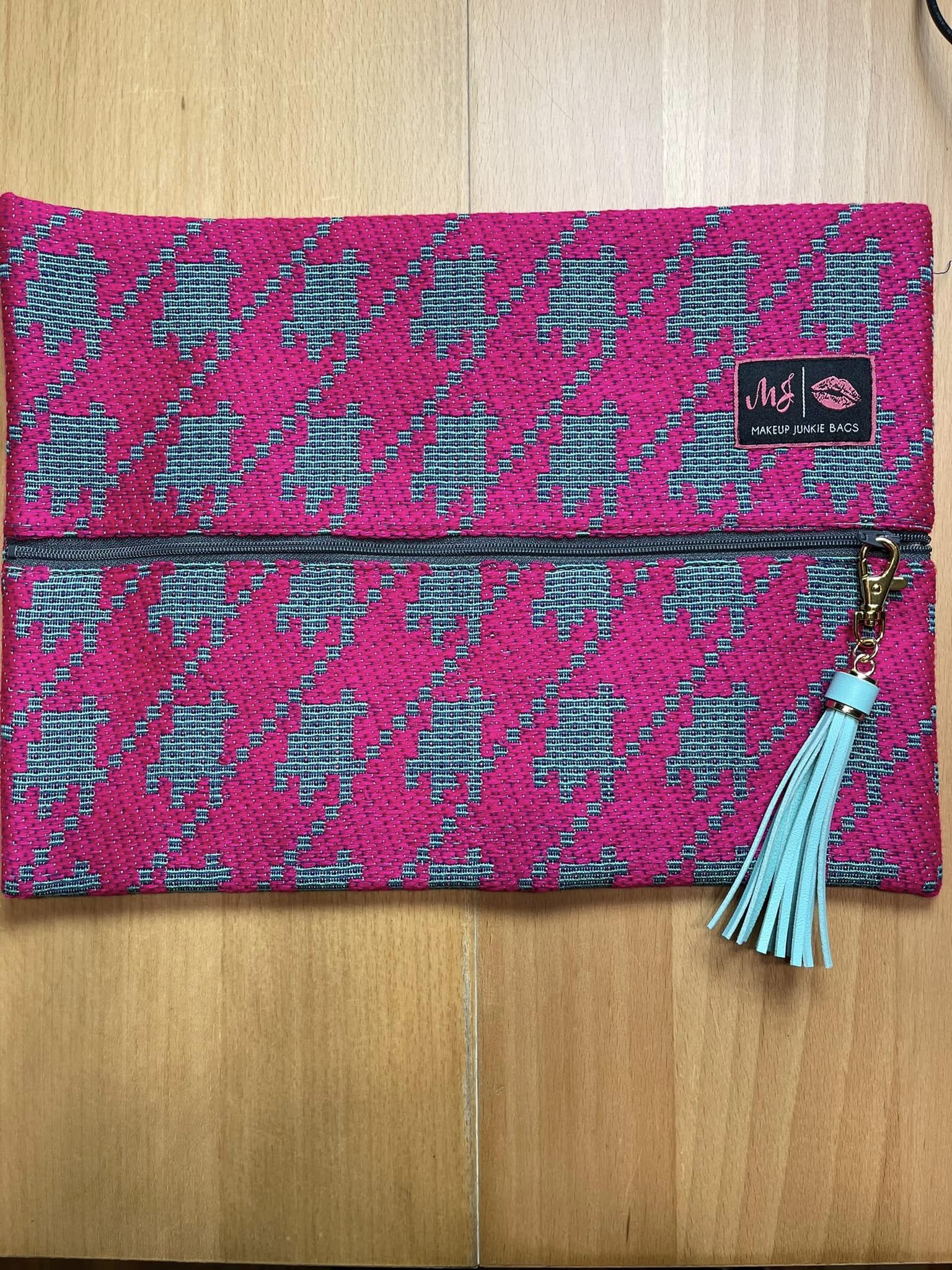 The Hot Houndstooth bag is a classic hot pink houndstooth woven textile on a teal woven background with a metallic gray wipeable interior. This staple piece will last you many years and seasons!