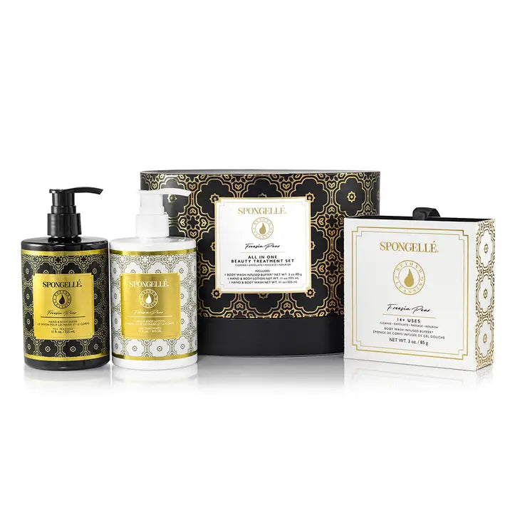 Give the gift of pampering with Spongellé’s Body Gift Set. Each set contains 1 Hand & Body Wash (70+ pumps), 1 Hand & Body Lotion (100+ pumps), and 1 Boxed Flower (14+ uses) for an All in One Beauty Treatment.